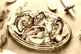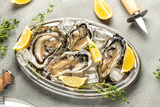 Oysters platter with lemon and ice. Restaurant delicacy, beautiful table setting, Seafood