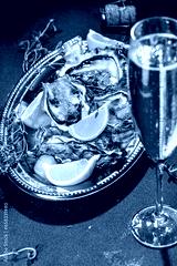 champagne and oyster. Restaurant delicacy. Saltwater oysters dish. vertical image. top view. place for text