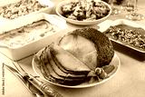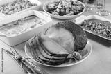 Holiday dinner with honey glazed spiral cut ham and all the sides