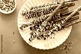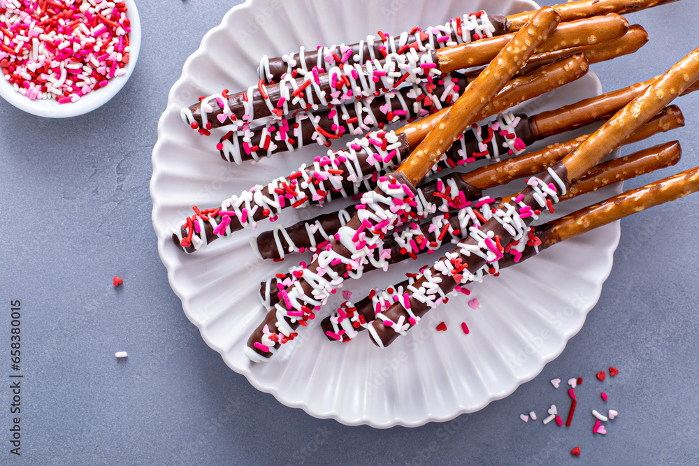 Chocolate dipped pretzel rods with pink heart sprinkles on a plate