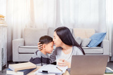 Asian little boy or son give glass of milk to his mom for her healthy at home after work Asian Mother kiss son for thank you during Single Mom work from home by using laptop computer at living room