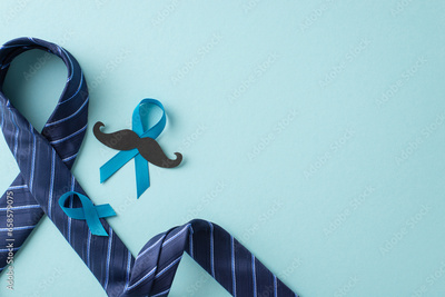 Men's Health Campaign. A top view of prostate cancer awareness symbols - blue ribbons, mustache, necktie - against a pastel blue backdrop with space for text or promotions