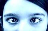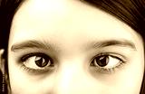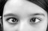 Strabismus in children causes, treatment concept. Female eyes with strabismus. Hypertropia. Strabismus. Black and white