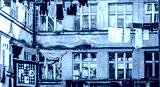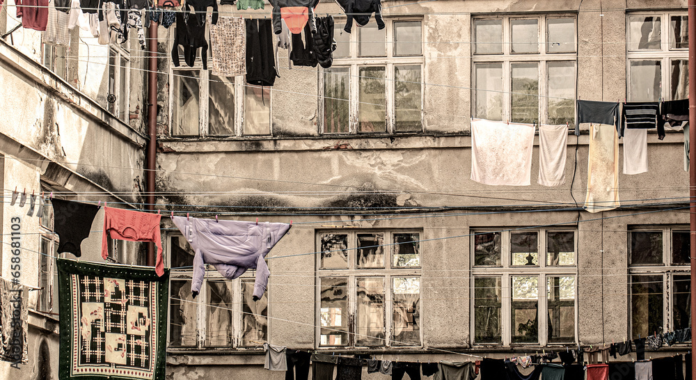 Poor district. Clothes hanging to dry on a clothes-line. Laundry dryings on the rope. Washed clothes drying outside of an old house. Poor district, houses of a poor district
