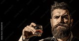 Sommelier tastes drink. Man holding a glass of whisky. Sipping whiskey. Portrait of man with thick beard. Macho drinking. Degustation, tasting. Bearded drink cognac
