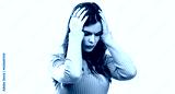 Brunette woman touching her temples feeling stress, on gray background. Woman hard headache holding hands on head. Black and white