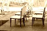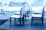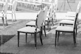 Luxury white-golden chairs on wedding ceremony outdoors. Festive decorations. Empty rows armchairs for guests. Outgoing wedding ceremony in the open air. Decor Studio.