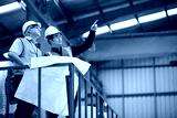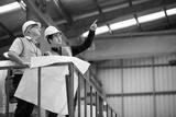 factory workers or engineer planning from work on blueprint drawing paper and pointing to something in the factory