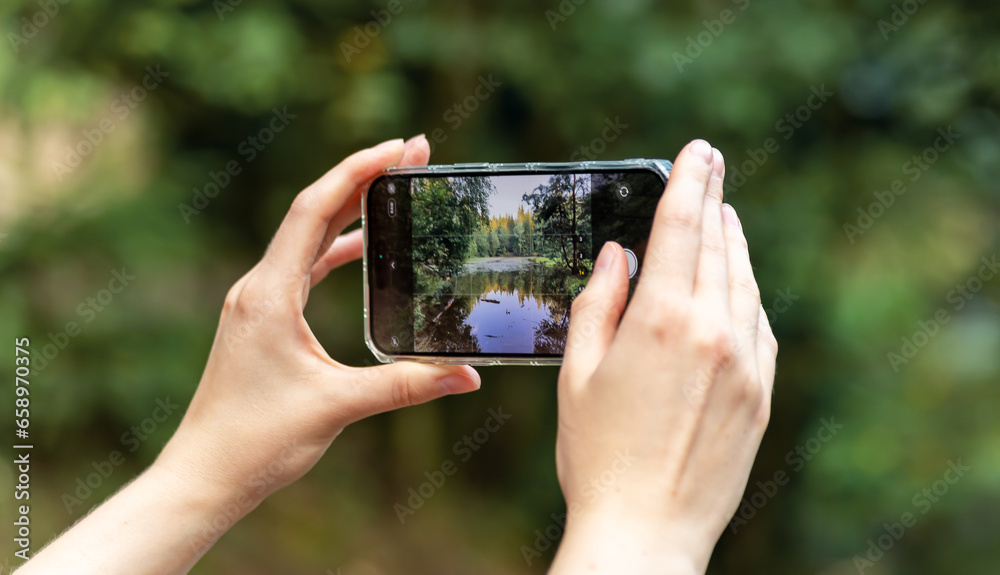 Hands holding smartphone, taking mobile photo, capturing nature, forest and lake