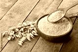 oat bran in bowl and in spoon with dry ears near on table