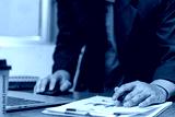Businessman pointing chart analysis document and paperwork financial plan marketing with laptop on desk office..