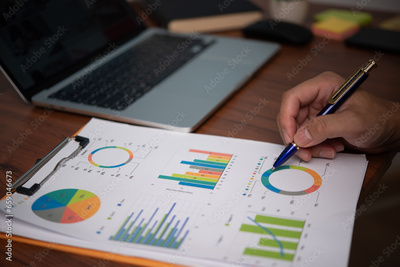 Businessman pointing chart analysis document and paperwork financial plan marketing with laptop on desk office..