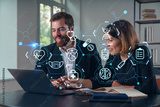 Thoughtful businesspeople typing on laptop at office workplace. Concept of team work, business education, internet surfing, brainstorm, project information technology. Medical healthcare hologram