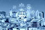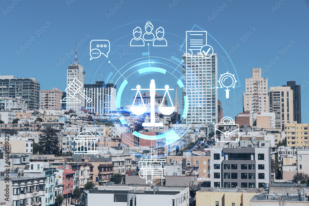 Panoramic cityscape view of San Francisco financial downtown, day time from rooftop, California, United States. Glowing hologram legal icons. The concept of law, order, regulations and digital justice