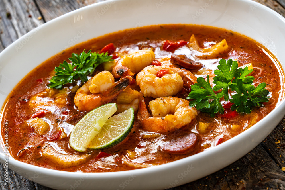Louisiana soup gumbo with shrimp, chorizo and white rice on wooden table