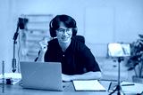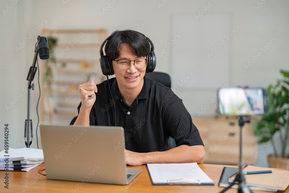 Man host working on laptop with microphone and recording audio podcast on smartphone in studio