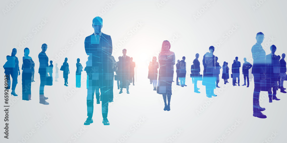 Group of multinational people and technology. Digital transformation. Wide angle visual for banners or advertisements.