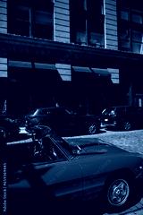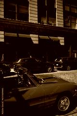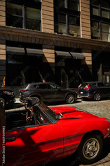 red vintage car and other vehicles parked near building on street in new york city, urban scene