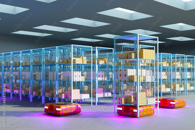 Robotic warehouse. Storage with AGV robots. Automated guided vehicles. Robotic warehouse. AGVs move warehouse racks. Innovative storage building. AGV technology. Retrieval machines. 3d image