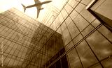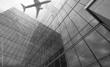 Airplane flying in the sky above modern sustainable glass office building. Exterior skyscraper green glass building. Business travel. Aviation business. Air logistics. Cargo plane. Departure flight.