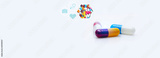 Medicine and health, pharmaceutical care concept. Colorful capsule pills with heart rate, stethoscope, medical equipment bag symbol. Prescription drug. Health checkup and hospital. Cardiology doctor.