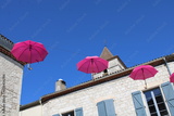 Octobre rose, parapluies roses dans le village sous le ciel bleu