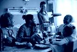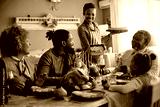 Happy black woman serving Thanksgiving dessert to her family at dining table.