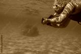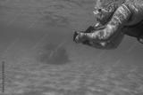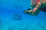 Man with photo camera taking photos and snorkeling underwater by coral reef in the Red sea, Egypt