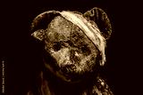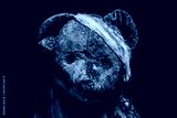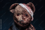 Old brown teddy bear wrapped in bloody bandages on a black background. Halloween concept