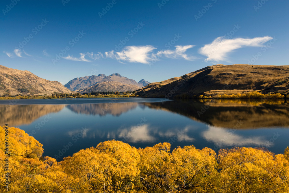Autumn colors on Lake Hayes located in the Wakatipu Basin in Central Otago, South Island in New Zealand