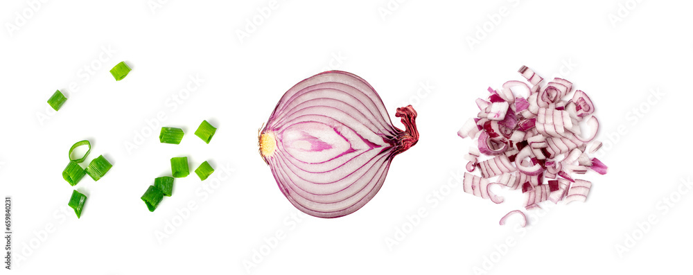 Red Onion Cuts Isolated, Raw Purple Onion Slices, Chopped Purple Onion Pieces