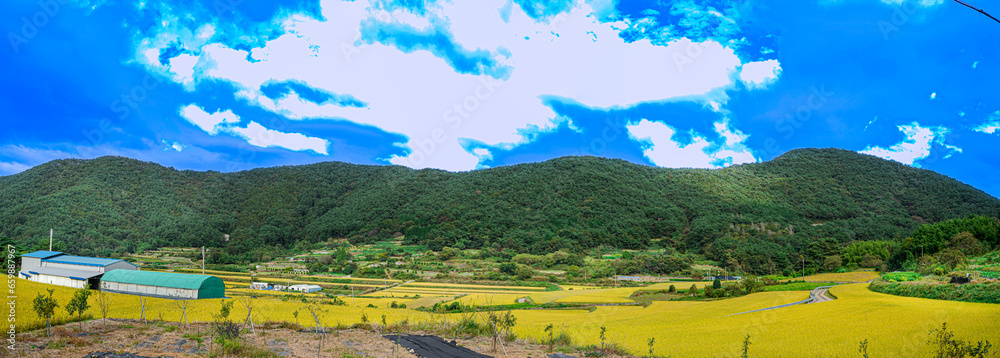 Panoramic view of a agriculture land in South korea with plants are paddy fields