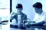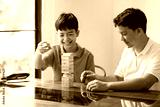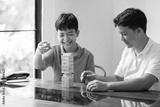 Father and son play board games and pull out wooden block from tower with family activity at home