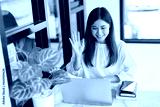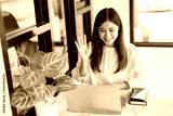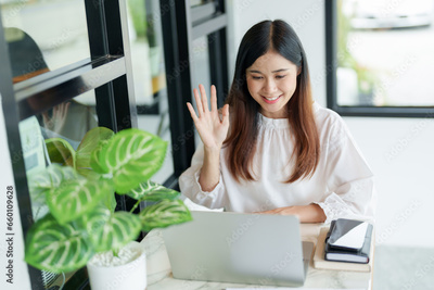 Writer woman use laptop to talking on video conference while working about business content in cafe