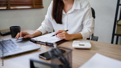 Businesswoman read business document and use calculator to working about calculating tax in office..