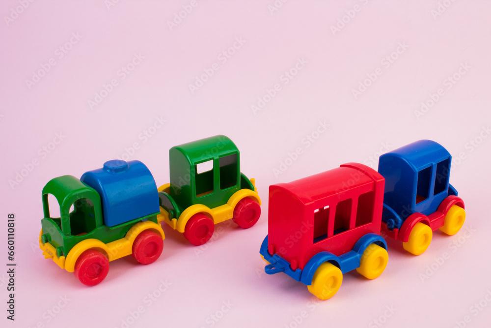 Children's toy, a multi-colored steam locomotive on a pink background.