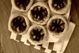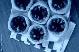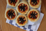 Halloween mini spider pizzas with black olives on plate on wooden table