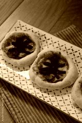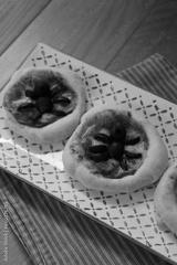 Halloween mini spider pizzas with black olives on a ceramic tray on wooden table