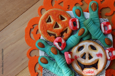Witch’s fingers, ghost and pumpkin cookies for Halloween on a plate on wooden table. Halloween background