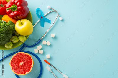 Diabetes Management: Top-down view of a blue ribbon emblem, insulin equipment, stethoscope, sugar cubes and a plate of nutritious foods, set against a pastel blue backdrop