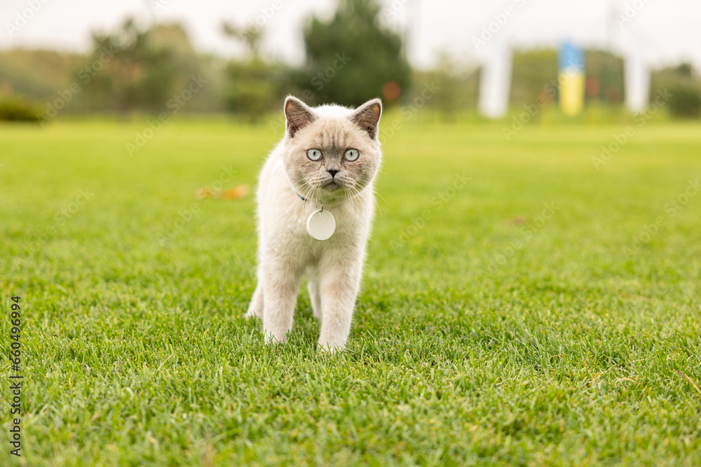 Young adult grey cat with big blue eyes walking in green grass at nature