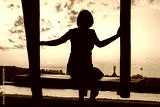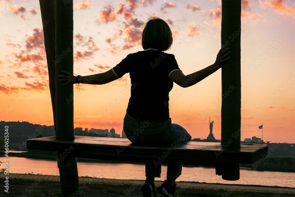 A woman sits on a wooden swing against the backdrop of sunset in Kyiv.