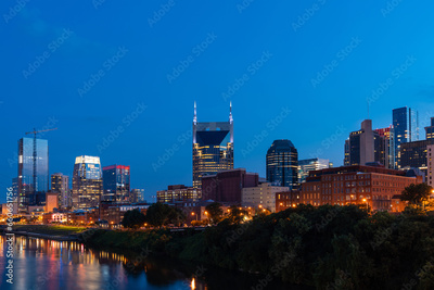 Scenic View of Broadway district of Nashville over Cumberland River at illuminated night skyline, Tennessee, USA. This city is known as a center for the music industry, especially country music
