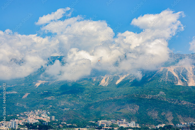City near the sea coast near the slope of mountains in Montenegro.