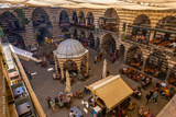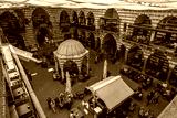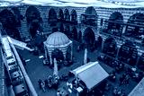 DIYARBAKIR, TURKEY, 05 OCTOBER 2023: View of the Hasanpasa Khan, medieval historic building where people have breakfast and small shops, the central of Diyarbakir,