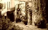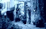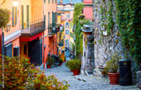 Bellagio, lake Como, Milan, Italy. Famous stone stairs street. Evening Nighttime with blue sky and lights of outdoor lanterns. Picturesque italian architecture famous luxury Alpine health resort