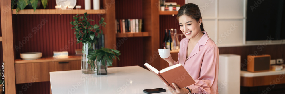 Woman sitting in living room to enjoying time with reading a book and drinking hot tea in home