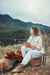 Camping, phone and woman relax in nature with social media, freedom or outdoor peace. Hiking, break and female explorer with smartphone, app or chat while chilling at forest lake and enjoying scenery