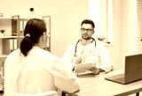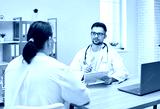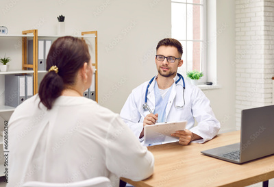 Overweight woman having consultation at doctor's office. Portrait of confident doctor holding report file with appointment and giving consultation to a fat patient examination room in clinic.