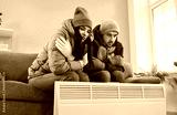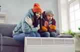 Freezing people warming themselves beside electric heater at home. Upset warmly dressed spouses sitting on sofa feeling cold and trying to warm up. Heating problems, power crisis concept